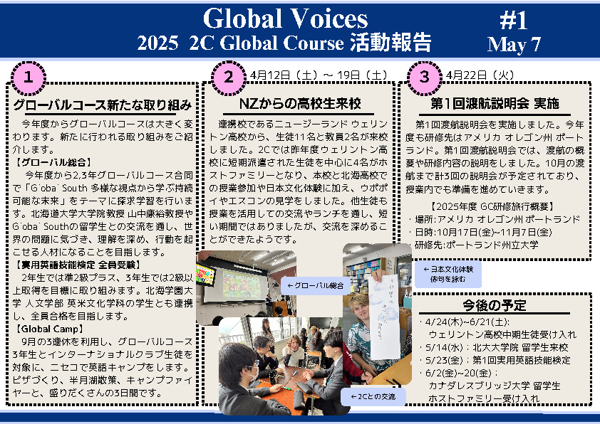 ① 今年度からのグローバルコース新たな取り組み ② ニュージーランド ウェリントン高校生団来校 ③ 第1回渡航説明会実施