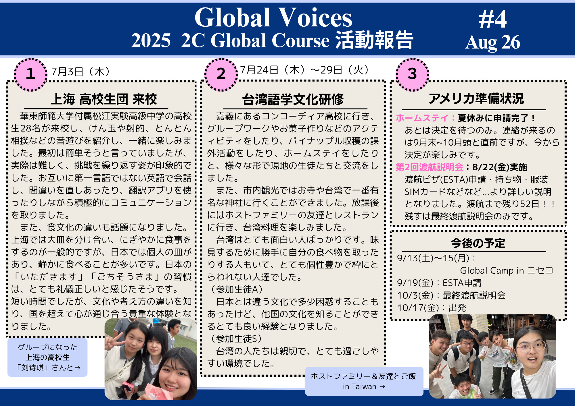 ① 上海 高校生団との交流 ② 台湾語学文化研修 ③ アメリカ準備状況