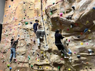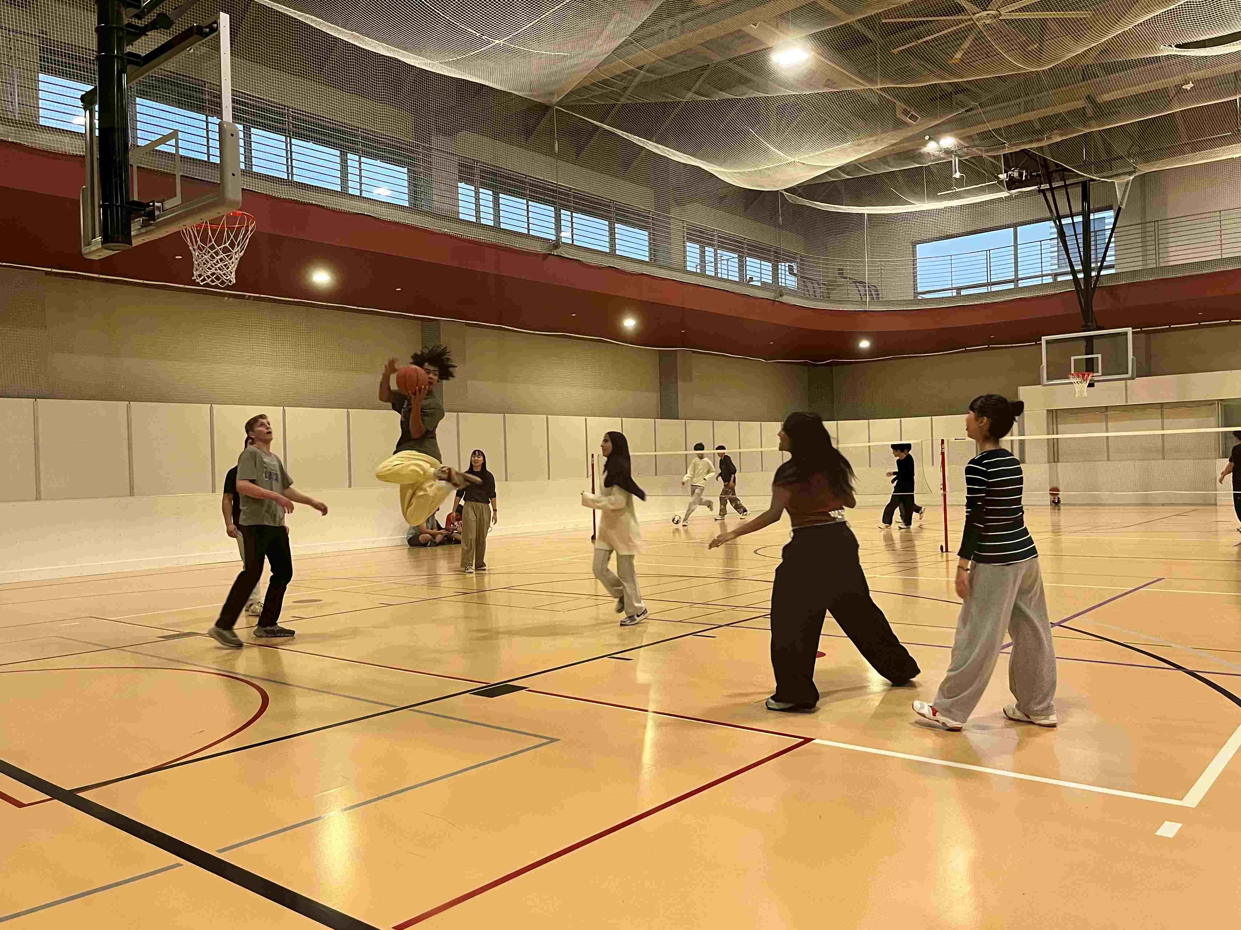 午後は、プログラムのサポーターの方々や大学生との英会話タイムからスタート。この3週間の出来事をはじめ、「なぜポートランドで暮らしているのか」「なぜこの大学を選んだのかなど」など、人生の先輩方と話をしながら、ゲームも交えて楽しいひとときを過ごしました。その後は、大学にある体育館へ。体育館と言っても、一般的な学校の体育館とは違い、本格的なトレーニング機器やロッククライミング施設、プールまであり、学生のみならず地域の方々の健康づくりにも役立っています。そんな施設をお借りし、様々なスポーツやトレーニングを楽しみました。その場にいたポートランド州立大学の学生とバスケットボールをする様子も!こちらで出会う人は誰もがフレンドリーです。