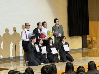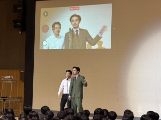 一昨年度から開催され、今年で3年目となった著名人講話会。ゲストは登場まで誰かわからないサプライズです。今年のゲストはお笑い芸人のコイオドリさんと、同じくお笑い芸人のトレンディエンジェルさんの2組でした。コイオドリのハギさんは、本校の卒業生です。