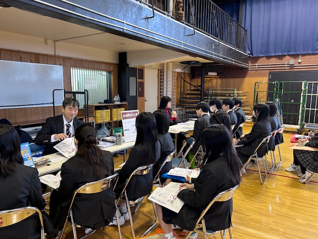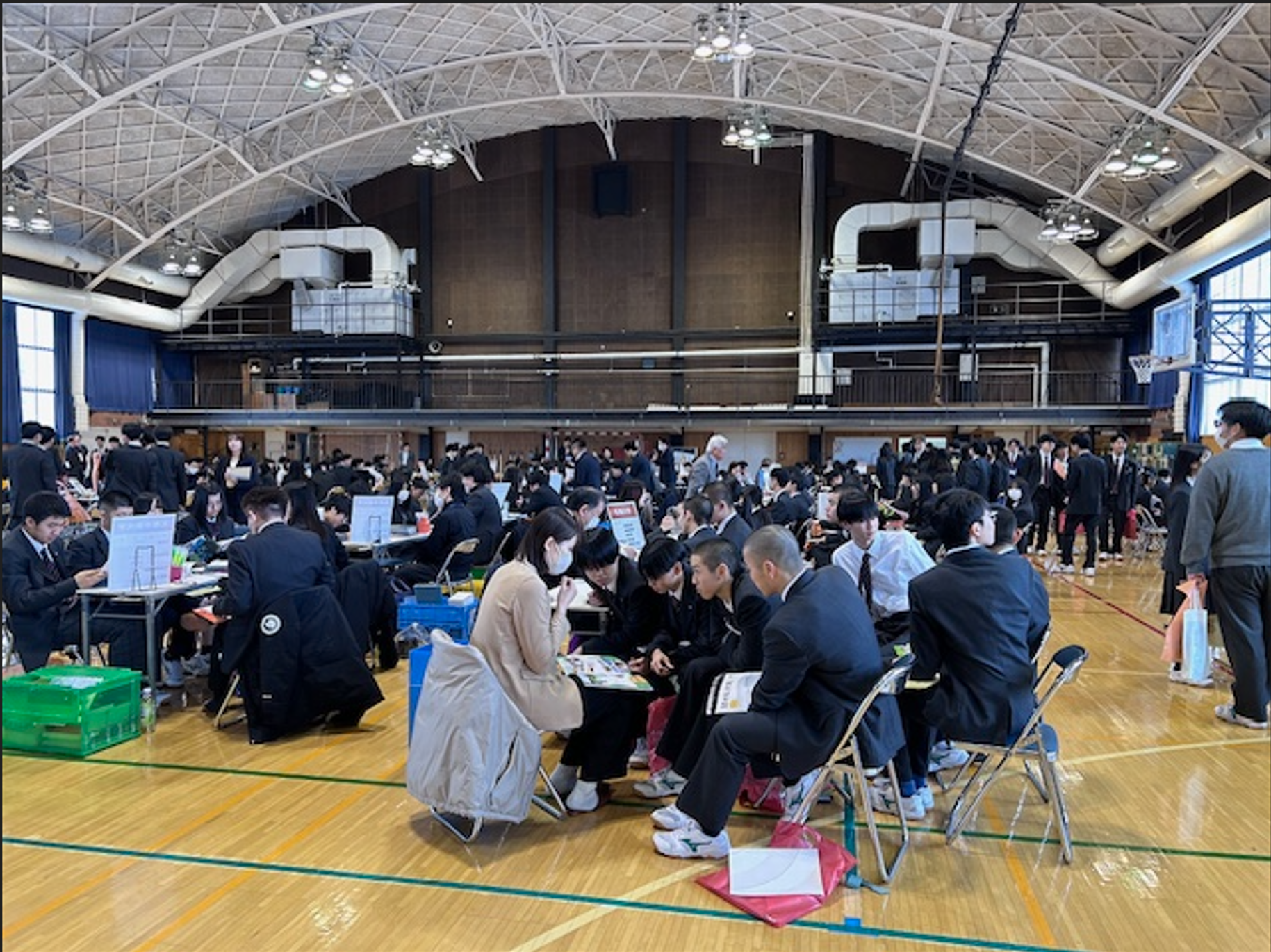 2025.12.22 1年生進路ガイダンスⅡを実施しましたお知らせ 12/22(月)に2回目の進路ガイダンスが行われ、76校の大学や専門学校のブースで説明を聞いて回りました。朝は寒かった体育館も、生徒の熱気ですっかり暖かくなりました。今日のお話を参考に、冬休み中、今後の進路をじっくり考えてみてほしいと思います。