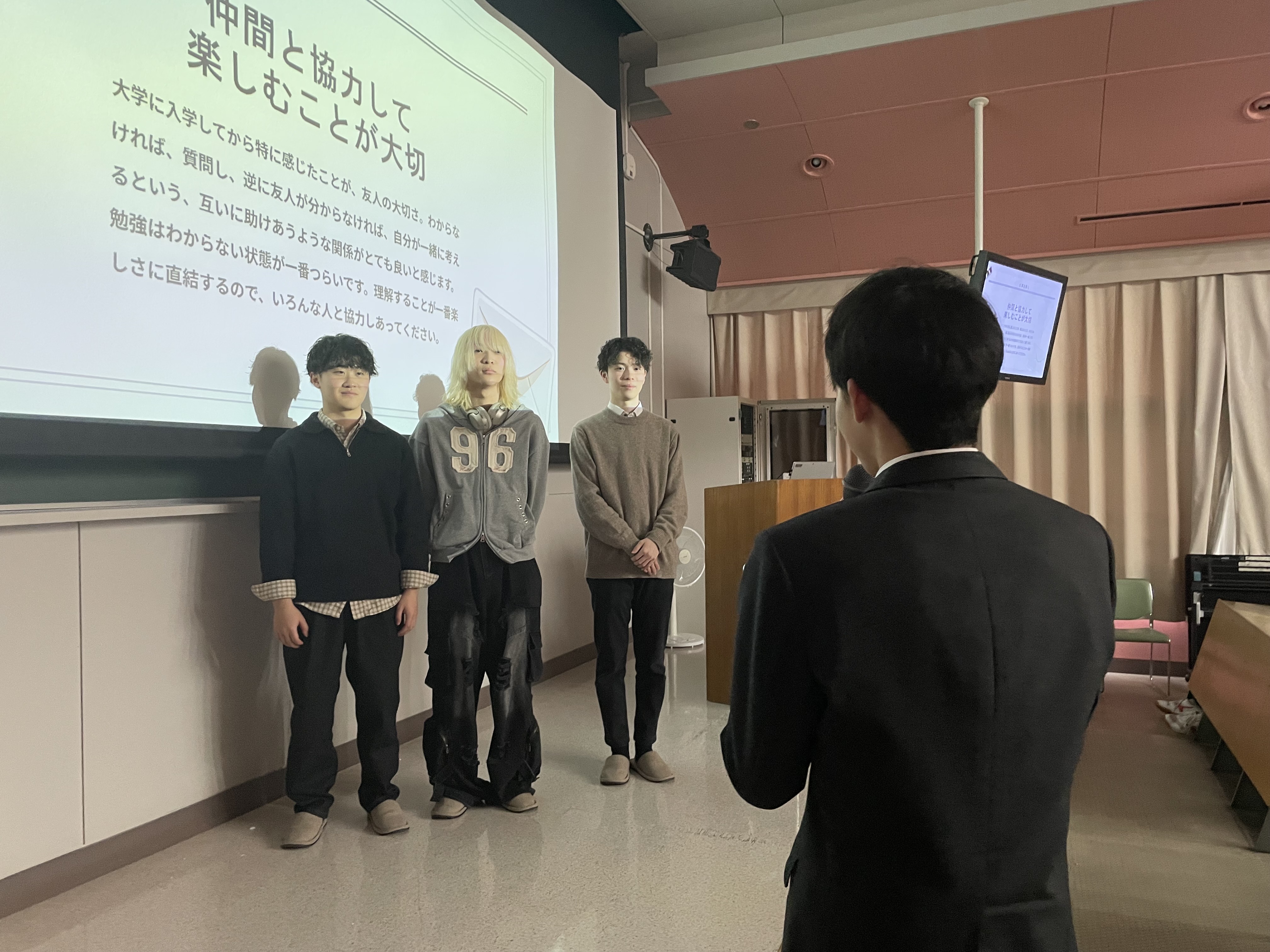 冬期講習の最終日、本校の卒業生である、「北海道大学 河野悠人さん(令和4卒)、北海道教育大学 森大地さん(令和6卒)、千歳科学技術大学 南川昊翔さん(令和7卒)」が来校し、講演をしてもらいました。