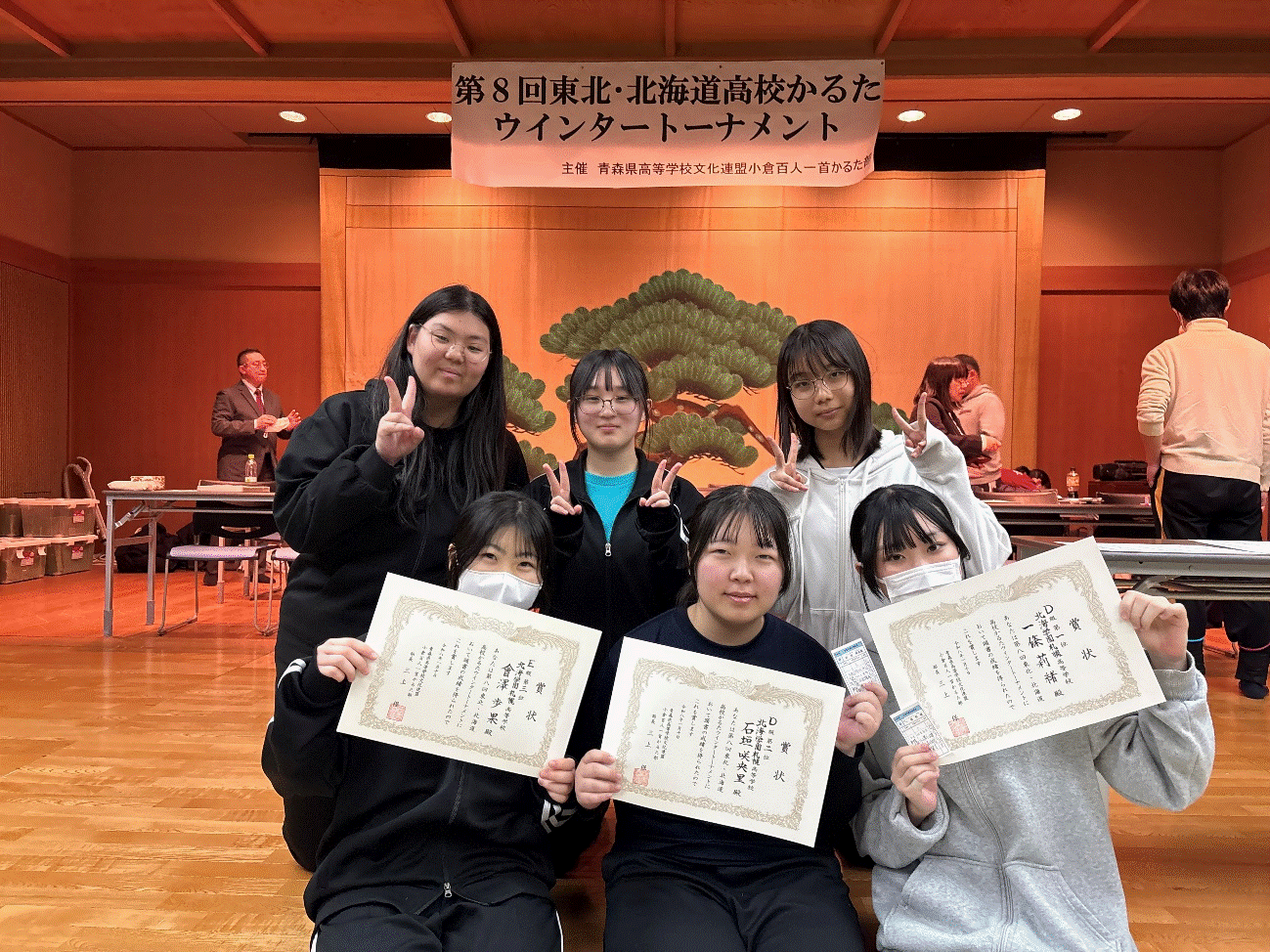 2026.01.14 かるた部 東北・北海道大会で活躍!部活動 競技かるた部が第8回東北・北海道高校かるたウインタートーナメント(個人戦・団体戦)に出場し、3名が入賞しました!3日間にわたり、東北・北海道の各地から集まった選手とたくさんの試合をすることができました。ここでの経験を活かし、さらなる実力向上を目指します!個人戦E級 3位 會澤歩果(1年)D級 優勝 一條莉緒(2年) 準優勝 石垣咲央里(2年)