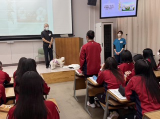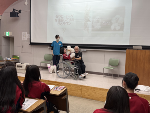 2026年1月28日(水)に、札幌どうぶつ専門学校より名取裕憲様・島田寧々様、学校犬の海くん・美々ちゃんにお越しいただき、セラピードックについての知識や、動物福祉や動物介在療法のあり方について講演していただきました。実際に介護の現場でのエピソードなどもお伺いし、セラピードックのもつ大きなパワーも感じることができました。