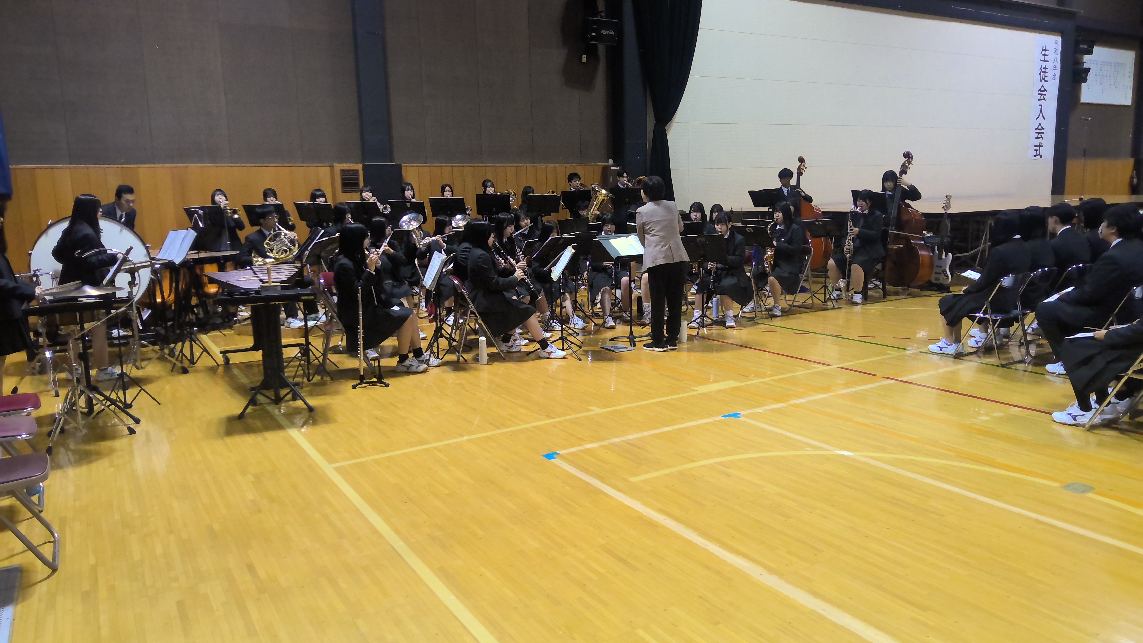 吹奏楽部の演奏に合わせて、新入生が2・3年生の待つ体育館へ入場し、生徒会入会式が開式されました。