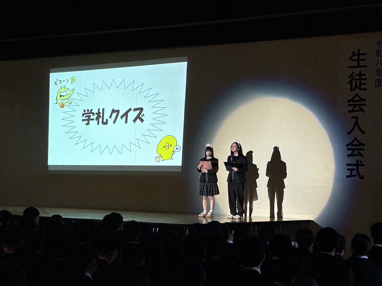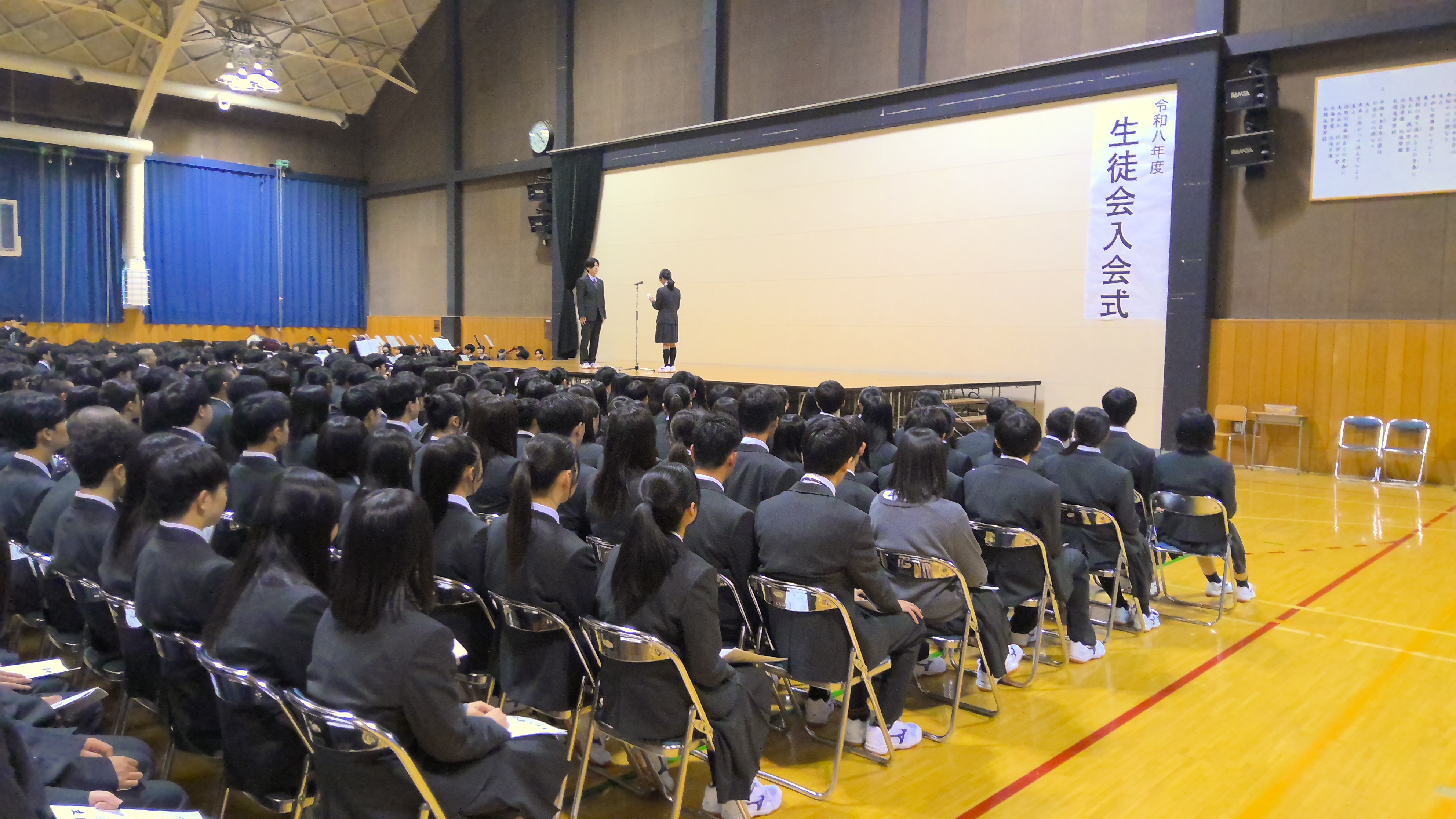 式では、生徒会長から歓迎の言葉が贈られ、新入生代表による挨拶が行われました。続いて、部活動紹介や生徒会による学校行事の紹介、学札クイズなどが行われ、会場は終始和やかな雰囲気に包まれていました。